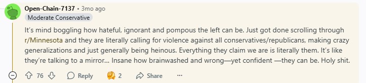 Instead of showing any sort of sympathy for the loss of life, he made fun of Tim Walz and called him a whacko. Conservatives on reddit had a little more sympathy, claiming that they wished for the assassin to be caught and killed. Others there could only talk about the “leftist response,” telling people that liberals were so wound up and needed to calm down or take it down a notch.