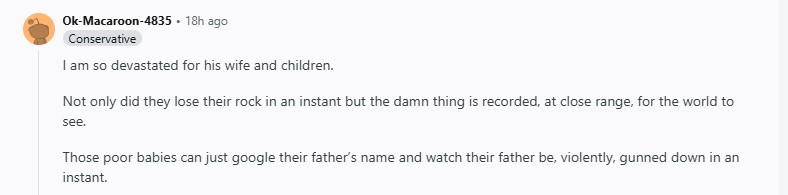 The response from conservatives on Reddit has been… interesting. While many of them follow their Dear Leader’s inclination to blame the left, others flock to show their humanity by exclaiming that on this day, a kind, light-hearted father and husband were taken from us! This man was full of joy in what her stood for and was a pinnacle of Conservativism!